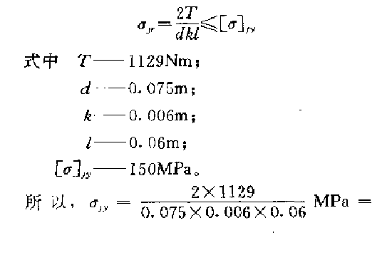 根據_上述診斷,確認故障的原因是由于左泵不工作所致。拆下左泵后發現驅動盤花鍵部位嚴重磨損,測量得到鍵的弦厚度不足2mm(使用極限是3.9mm) ,輸出軸端花鍵弦厚度1.2mm。維修的最好辦法是更換輸出軸與驅動盤,但由子備件價格昂貴,而且貨源缺,所以應該設法進行必要的維修。由于輸出軸端花鍵長度約為80mm,直徑約為75mm ,因此考慮在原來花鍵部位重新開槽安裝平鍵,改花鍵聯接為平鍵聯接。選擇平鍵型號是 1320X60(GB1094-79),平鍵材料選擇45鋼,由于原花鍵聯接面采取強化熱處理,因此,在加上鍵槽時采用電火花切割。平鍵強度校核如下,即能滿足強度要求。